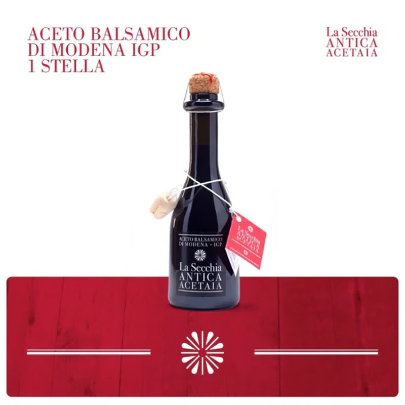 L'Aceto Balsamico di Modena IGP 1 Stella è un condimento ricavato da mosti d'uva e aceto di vino selezionati, affinato in barrique di Rovere da 225 litri.