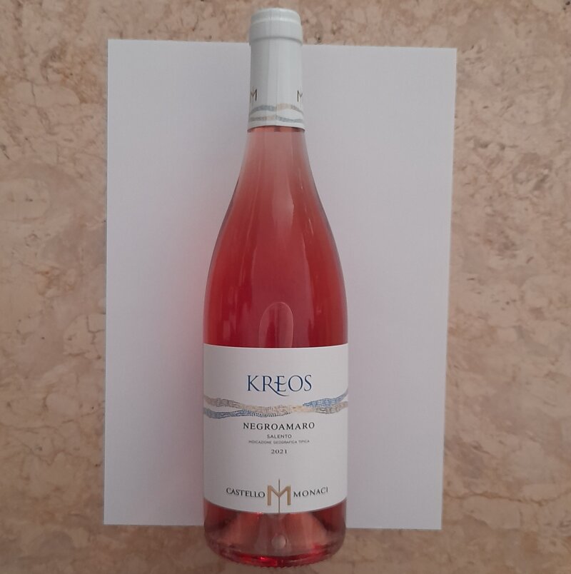 KREOS Negroamaro Rosato del Salento IGT Kreos è l’unico rosato di Castello Monaci. Kreos si presenta come un vino molto versatile con una spiccata spalla acida e molta eleganza. Il nome del vino richiama il mito greco di Eos, la dea dell’aurora che Omero chiamò “dea dalle dita rosate” per l’effetto che si vede nel cielo all’alba. 12,5% VOL. 75 CL.