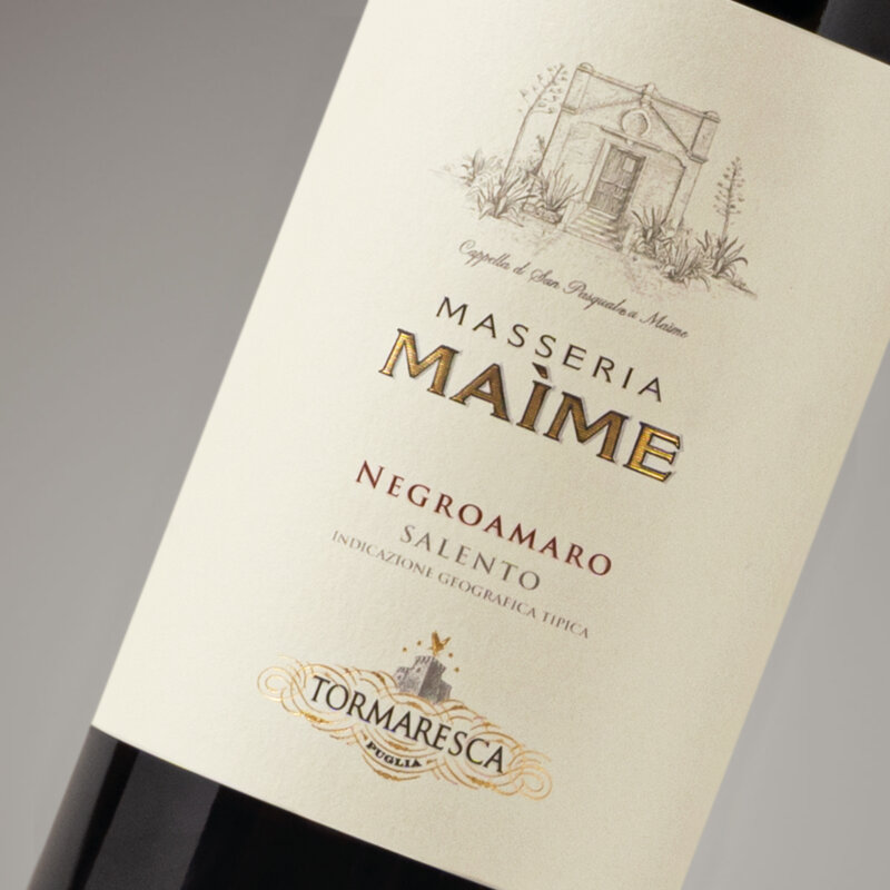 Masseria Maìme si presenta di un colore rosso rubino. Al naso presenta note di fruttate di marasca, prugna,